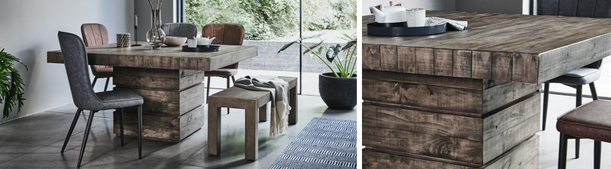 Eco-friendly furniture with plenty of chic designer style. The Folsom range of dining and occasional furniture transforms reclaimed pine and pallet wood into chic, modern dining and occasional furniture. Discover generously sized square and rectangular dining tables, characterful occasional tables, sideboards and dining benches – every piece unique and beautifully finished with a clear lacquer to show off the natural characteristics of the wood grain. Contemporary dining chairs in antiqued faux leather complete the range. Exclusive to Furniture Village at a fantastic price.